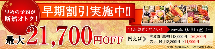 【匠本舗】4~5人前 おすすめNO.1【京都岡崎 味ま野「翆柳」♪】早期割引で10月末まで【48,000円が21,700円OFFの 26,300円♪】とってもおいしい 生おせち〈2025.10月〉